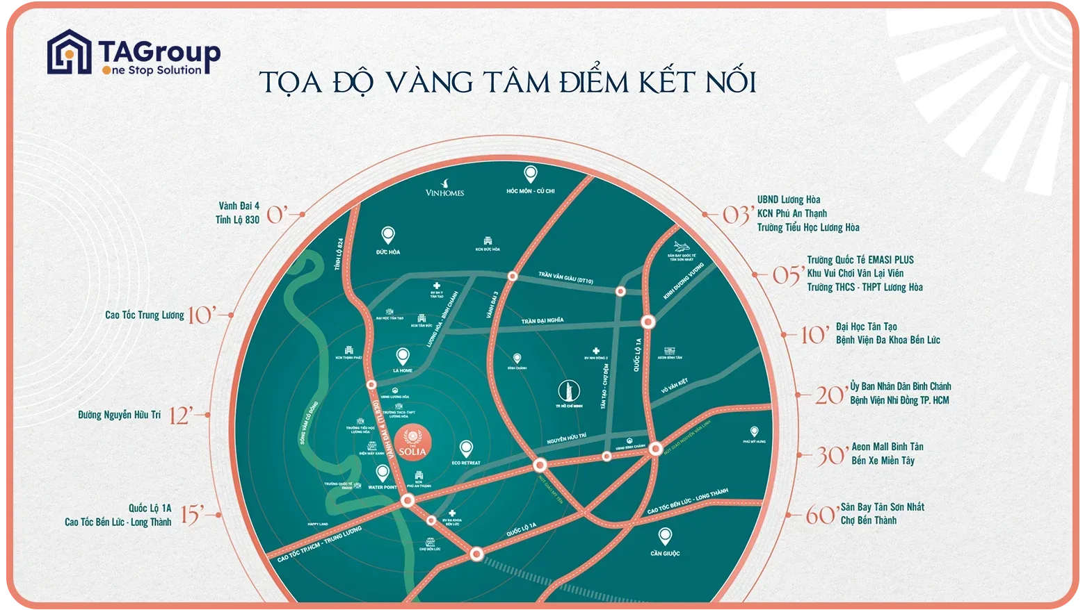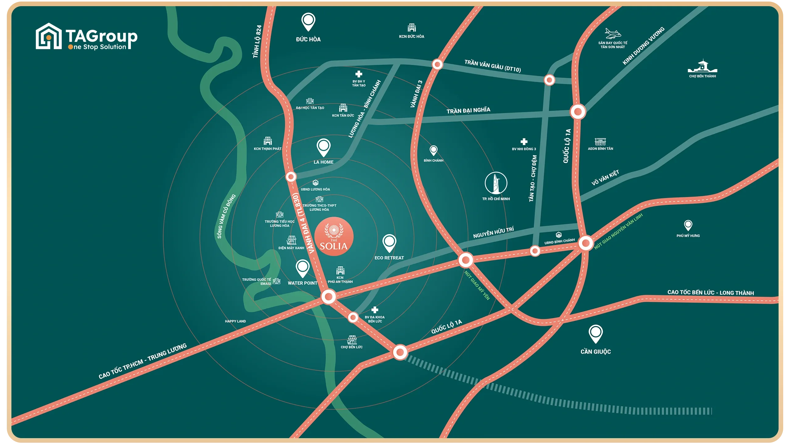 Tọa lạc tại vị trí chiến lược, The Solia sở hữu khả năng kết nối không giới hạn, giúp cư dân dễ dàng di chuyển đến mọi tiện ích. Chỉ trong 3 phút, bạn đã có mặt tại UBND Lương Hòa, KCN Phú An Thạnh; 5 phút đến Trường Quốc tế EMASI PLUS; 10 phút đến Đại học Tân Tạo, Bệnh viện Đa khoa Bến Lức. Với thời gian di chuyển 30 phút, bạn có thể đến Aeon Mall Bình Tân, Bến xe Miền Tây; và 60 phút để tới Sân bay Tân Sơn Nhất hay Chợ Bến Thành. Nằm gần các tuyến đường huyết mạch như Cao tốc Trung Lương, Quốc lộ 1A và Cao tốc Bến Lức – Long Thành, The Solia chính là tâm điểm sống và kết nối lý tưởng cho mọi gia đình.